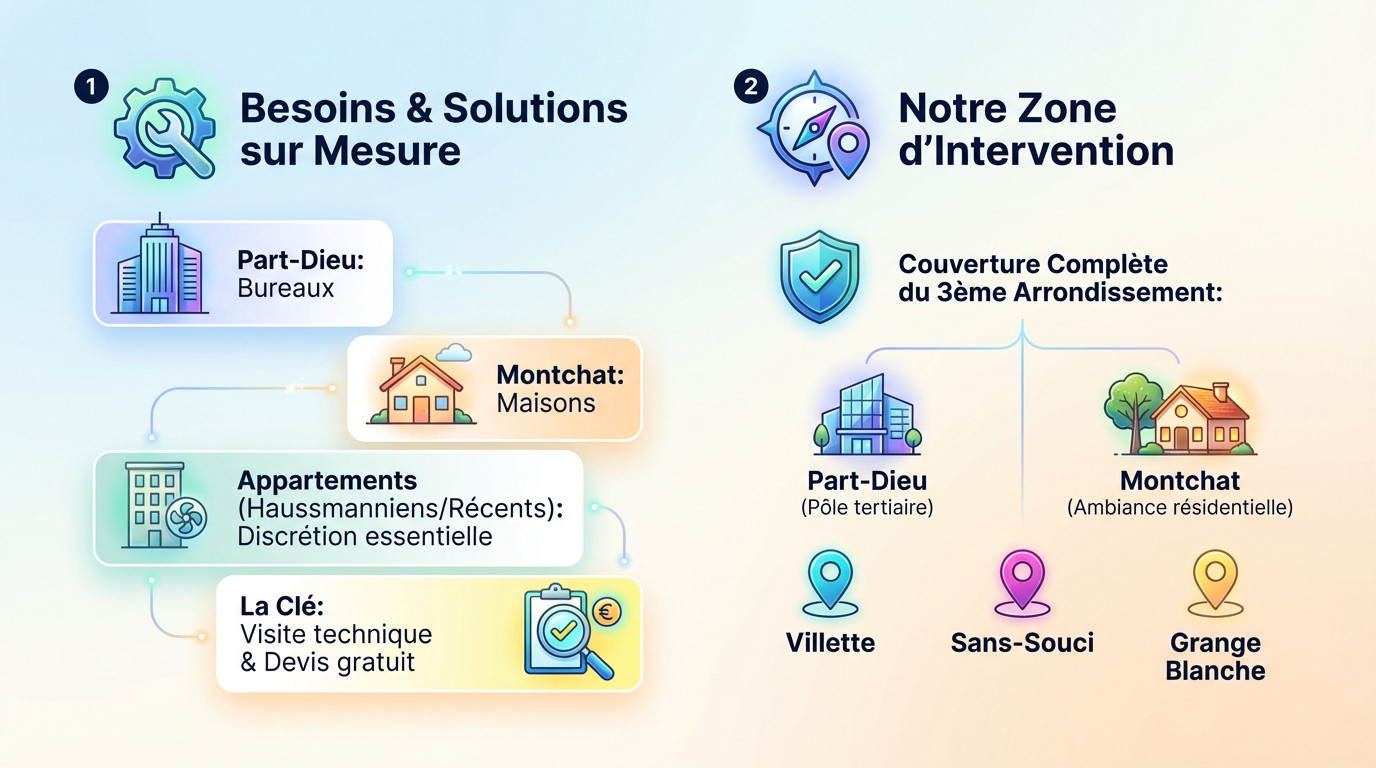 Le 3ème arrondissement de Lyon est loin d’être uniforme. Les besoins thermiques d’un bureau vitré à Part-Dieu n’ont rien à voir avec ceux d’une maison familiale à Montchat. On maîtrise ces nuances sur le bout des doigts.